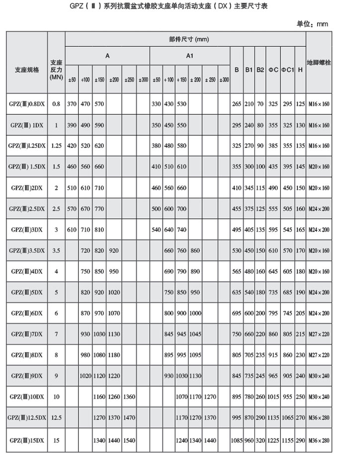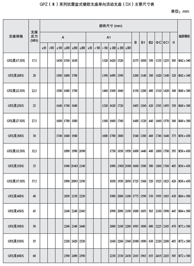 盆式橡膠支座按其使用時的位移能力分為二類,即單向活動支座具有豎向 轉(zhuǎn)角功能和單一方向位移功能,代號DX;
