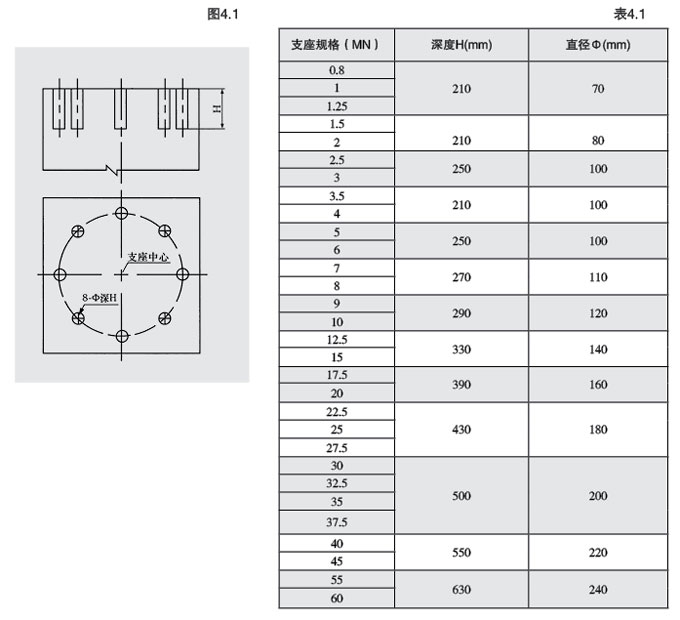 a.澆注壤臺墊石時,在墊石頂面做出地腳蜾栓套筒預留孔。如圖4.1所示,預留孔深度及直徑見表4.1。