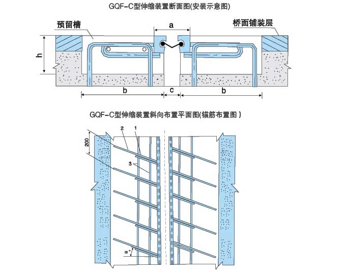圖中:h、b分別為預(yù)留槽深度與寬度,a為錨固筋與邊梁之間的角度,用戶可根據(jù)橋梁實際預(yù)留槽尺寸 選擇GQF~C、GQF-F. GQF-E. GQF—Z. GQF~L中所列任一種,如用戶有特殊要求,可向我公司提 供具體圖紙,我公司將為您另行設(shè)計。