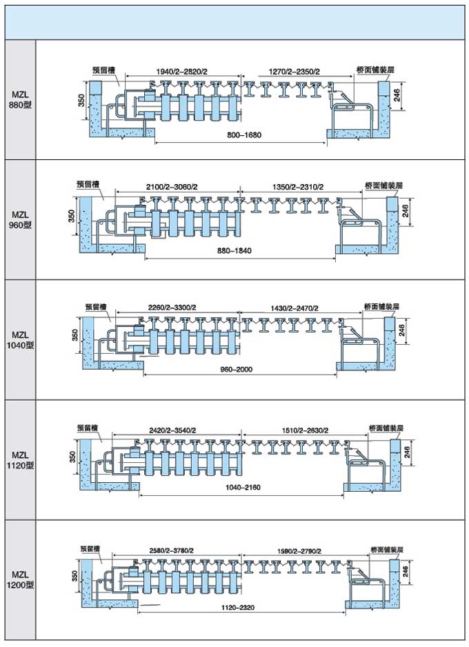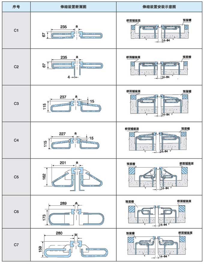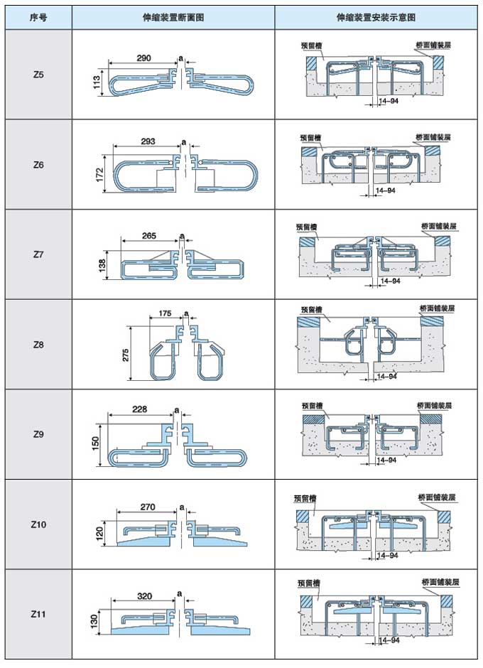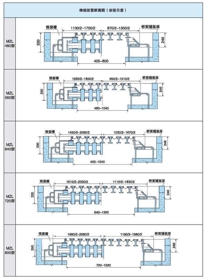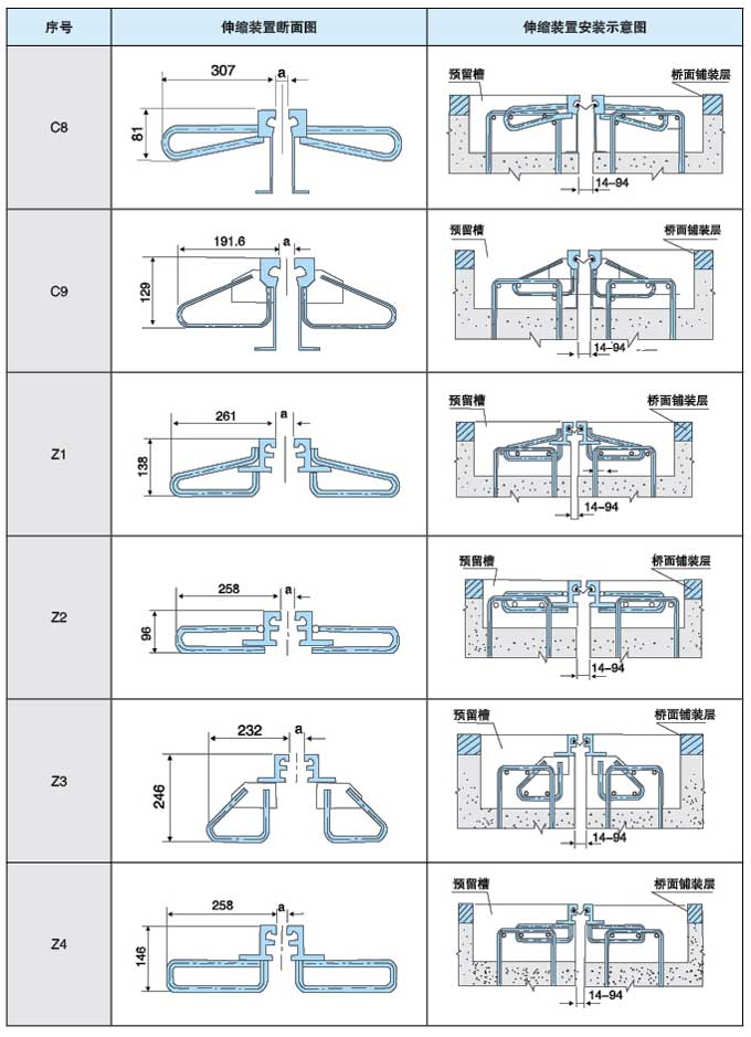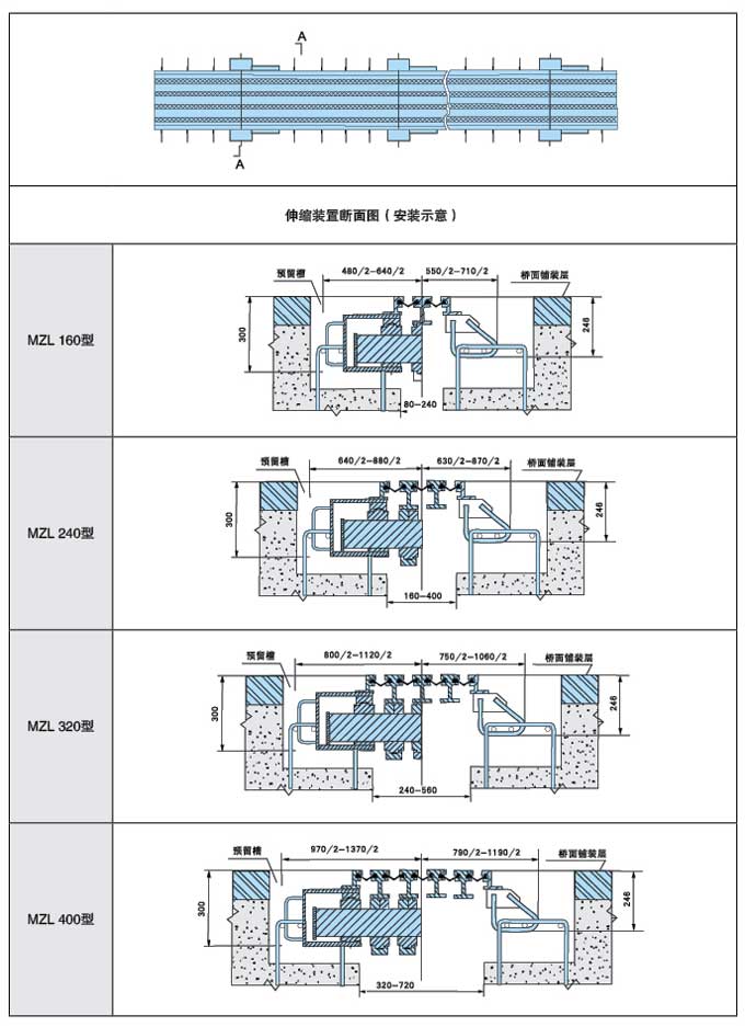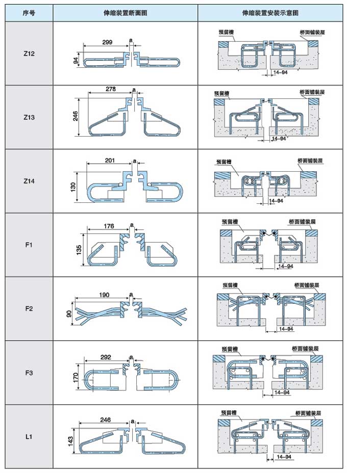 淺埋式橋梁伸縮裝置各種規(guī)格總體尺寸與安裝示意圖