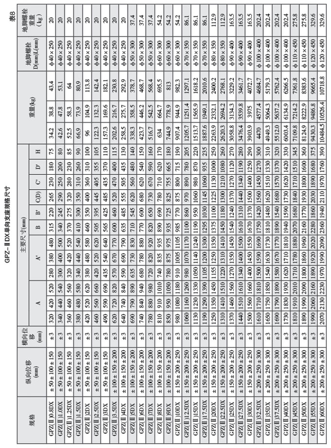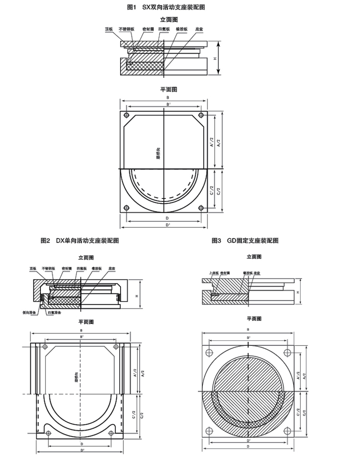 3.GPZ(II)系列盆式橡膠支座結(jié)構(gòu)形式及規(guī)格系列: 雙向(多向)活動支座和單向活動支座由上座板(包括頂板和不銹鋼滑板)、聚四氟乙烯滑板、中間鋼 板、密封圈、橡膠板、底盆、地細燦栓和防塵罩等組成,單項活動支座沿活動方向還設有導向擋塊。