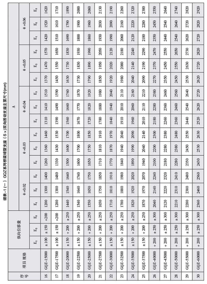 1、支座豎向承載力分為30級(jí),1000、1500、2000、2500、3000、3500、4000、4500、5000、6000、 7000、 8000、 9000、 10000、 12500、 15000、 17500、 20000、 22500、 25000、 27500、 30000、 32500、 35000、 37500、 40000、 45000、 50000、 55000、 60000kNo