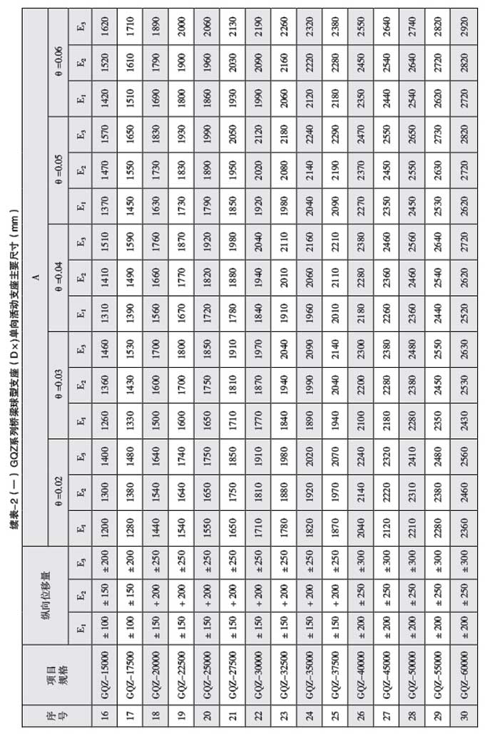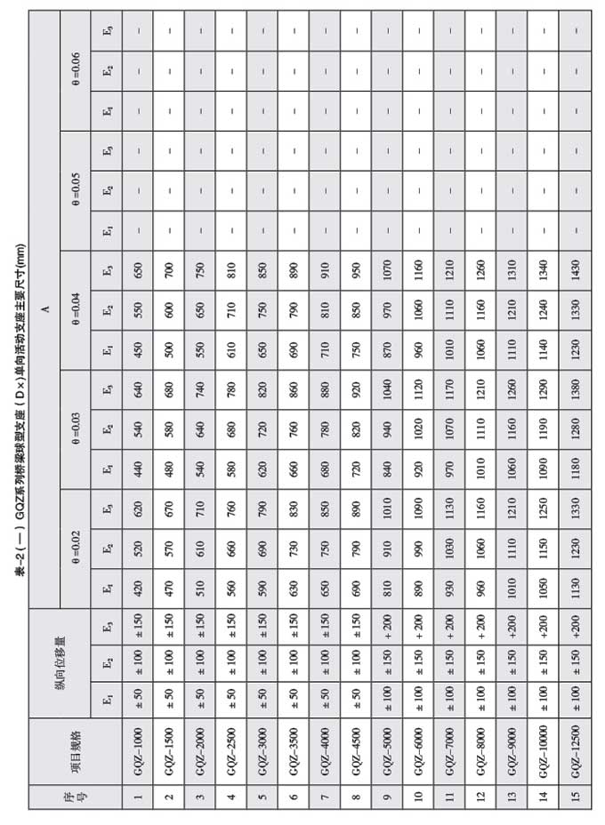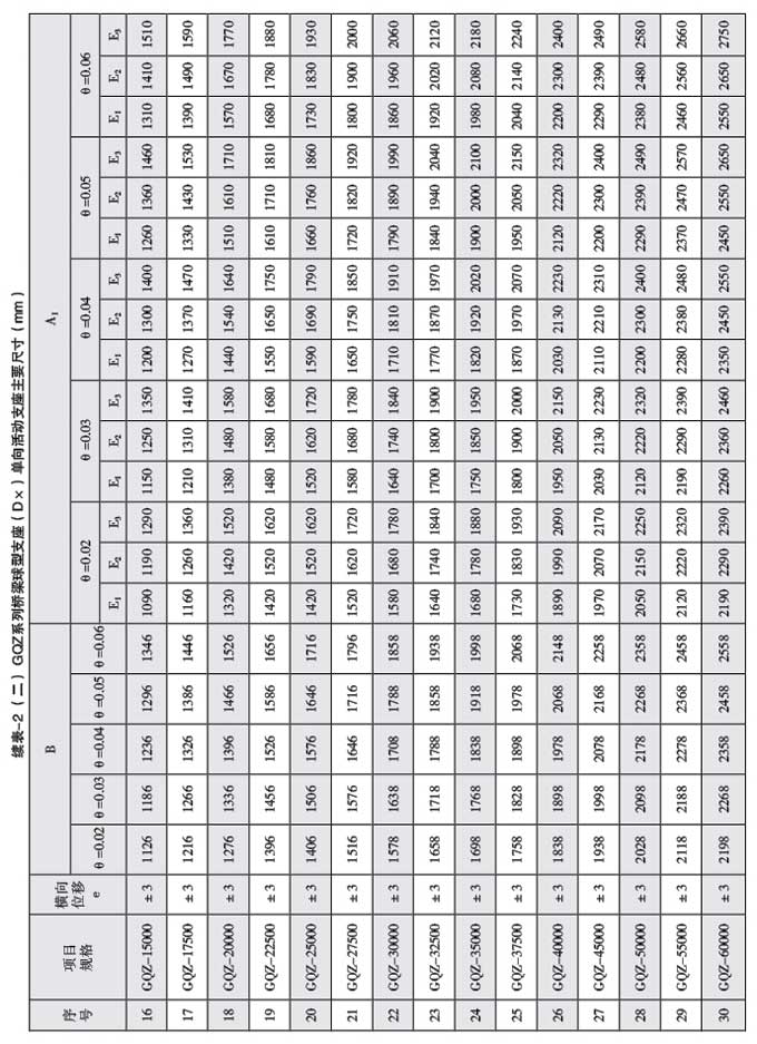 橫向位移:SX(雙向活動(dòng)支座),1000~9000kN, e=±20mm, 10000~60000kN, e=±40mm DX(單向活動(dòng)支座)e=±3mm,支座縱向、橫向位移量還可根據(jù)實(shí)際需要進(jìn)行調(diào)整。